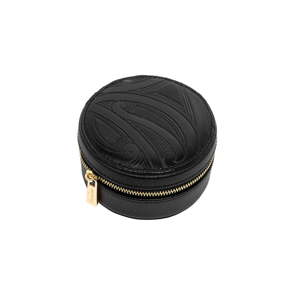 Available in Black PU vegan leather with an embossed Mangōpare design and gold Rerehua zip. Soft black velvet material inside with a number of compartments to keep your favorite jewellery pieces safe.
