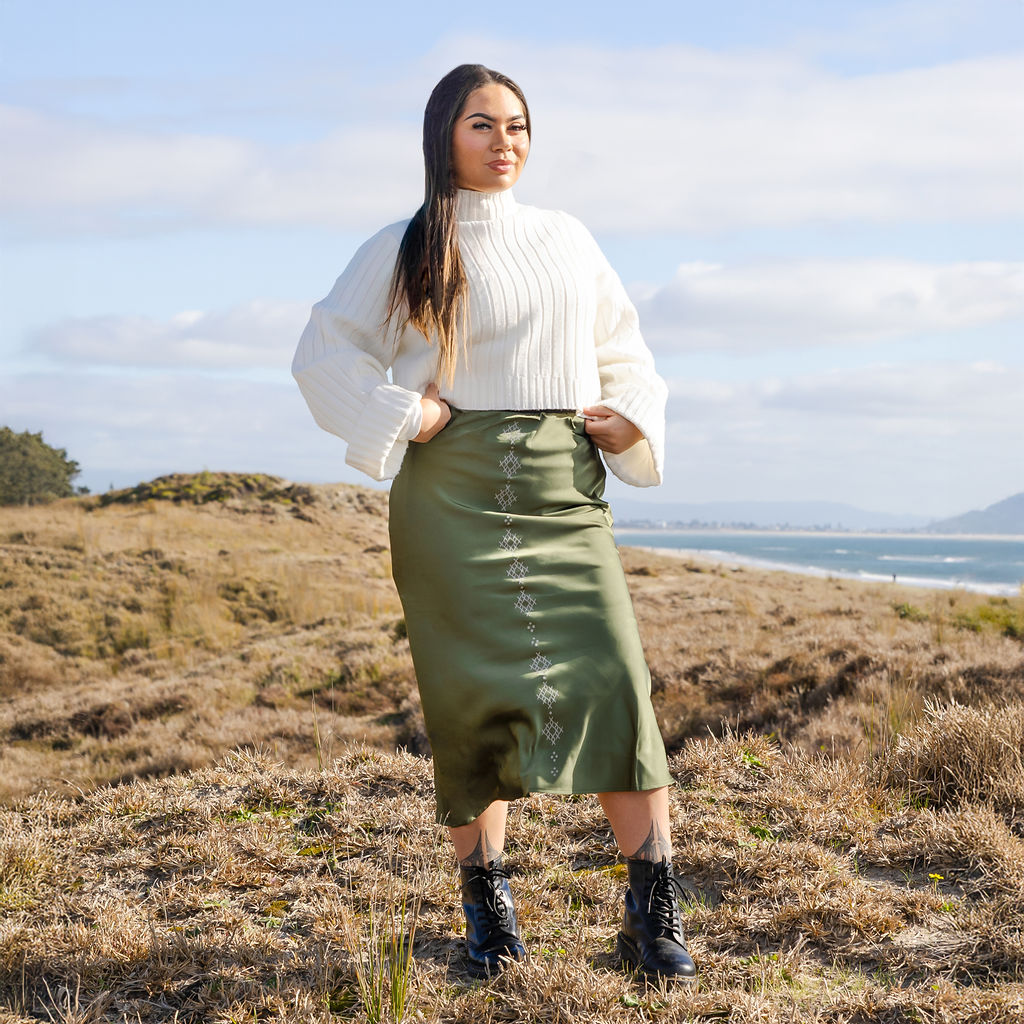 The Puāwai Satin Skirt features the iconic pātiki design representing abundance, prosperity and manaakitanga. The placement speaks directly to whakapapa, as we carry the hopes of our tūpuna and mokopuna to thrive and live in abundance.